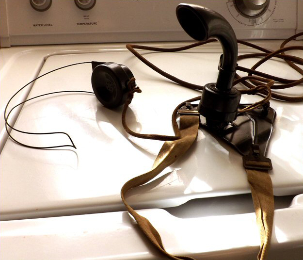 A Western Electric 201 D1 which is an earlier version of the Model 201 above. The distinguishing feature is the older, heavier headset. This phone is also equipped with a rotary dial. |