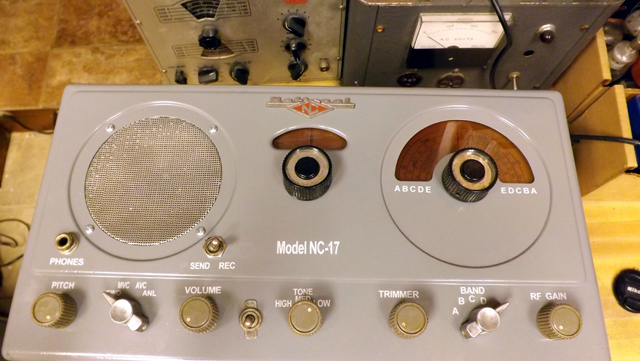The completed NC-57 restoration. Click the photo to see a short video of the receiver in operation. While the extra "power" switch was a modification to the set, probably the result of a previous owner not being able to obtain a replacement volume control with a built-in switch, we decided to leave this in place so as to not have to make an obvious repair to the hole in the cabinet. The decals for the front panel arrived about a week after the main restoration was completed. The photo below shows the final state of the front panel, including the installed decals from Vintage Radio Labels (http://vintageradiolabels.com/). These folks produce custom decals to order. |