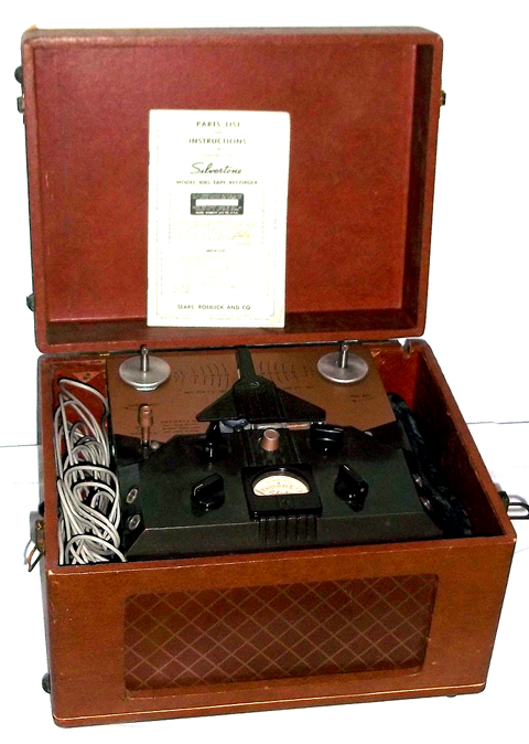 Not long after the magnetic wire recorder was introduced to the civilian market, the technology was replaced by recorders that used magnetically coated paper and later plastic tape as the recording media. This recorder, sold under the Sears Silvertone name, was a prime example of early 1950s tape recording technology. Once magnetic tape recording was perfected, it was not long before commercial broadcasters switched from 16" vinyl transcription disks to magnetic tape for archival and delayed programming. |