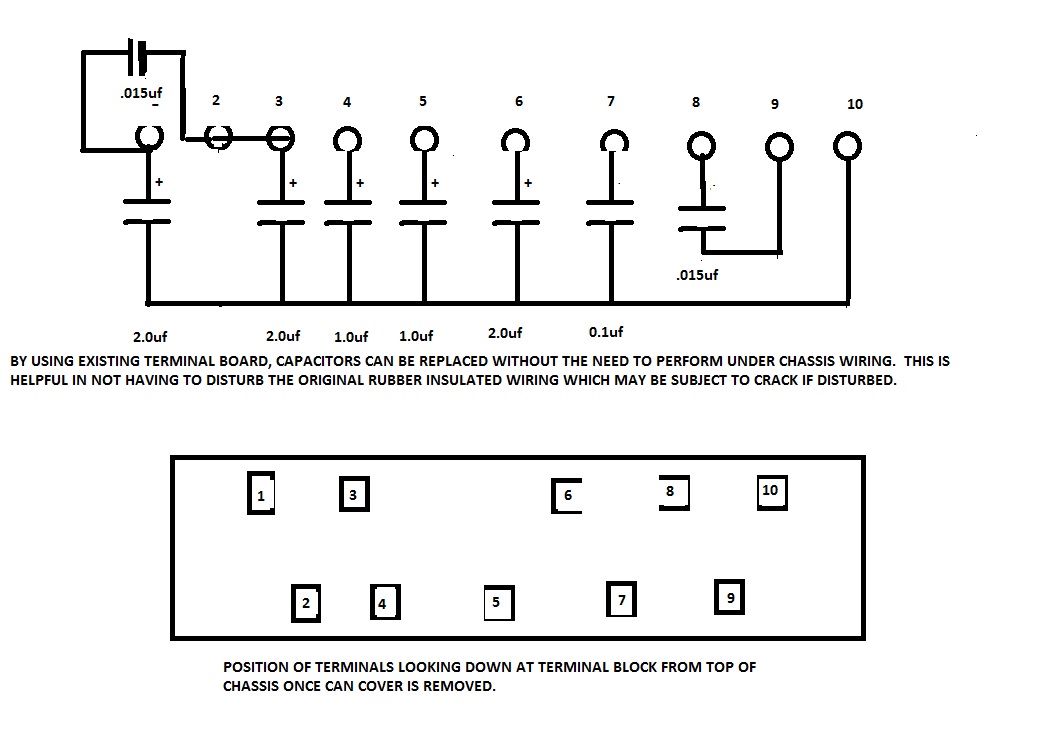 Shown above is the electrical details of the capacitor bank. There are three 2 Uf / 450 VDC electrolytics, two 1.0 Uf / 450 VDC electrolytics, a 0.1 UF and two .015 Uf fixed non-polarized 450VDC capacitors in the assembly. They should be wired to the terminals as shown in the drawing above. Be sure to observe polarity on the electrolytics. . |
