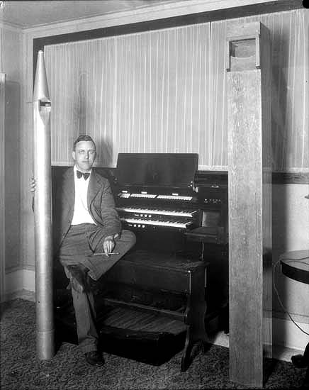 Although organist Carl Henke is shown here at a Hammond, a brochure that was produced by the station, shows a pipe organ having been located there in one of the historic photos from the station's history. It is not known whether this organ was a former instrument at the station, although we suspect that the photo of Henke at the Hammond was a photo current at the time of the anniversary brochure's production, and therefore he was shown at the station's organ at that time. |