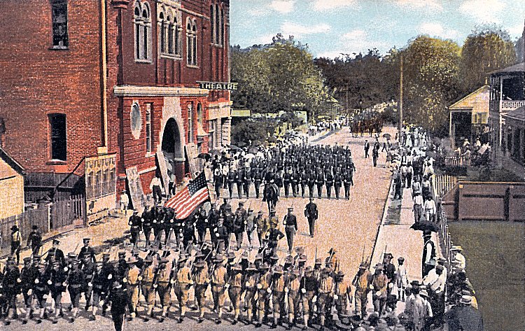 The Louisiana Guard passes in review in front of the Rapides Theatre, around 1910.