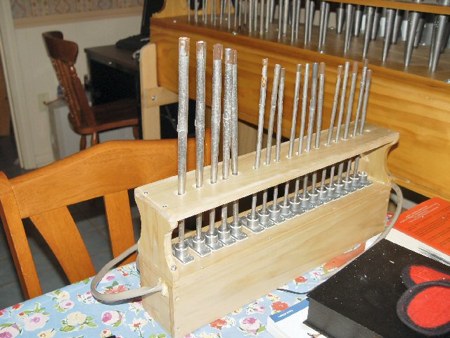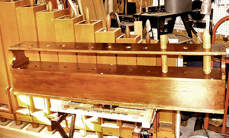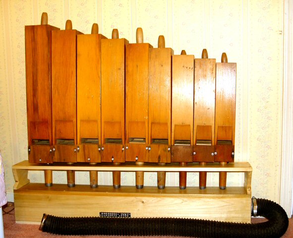 We offer a complete line of treble and bass offset chests with up to eighteen notes per unit. Shown here is our 18 note treble string offset. Below is our 8' string rank 12 note offset. All chests employ dependable electric action for low maintenance and high dependability. |