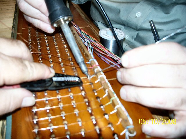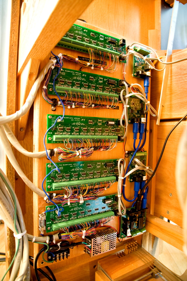 Above: custom built control system allowing conversion of Casavant console for use as a virtial organ. Below: retrofit of a 1930s Möller organ keyboard during the conversion of the original Möller console for use with a custom built DeMajo Virtual Organ System. |
